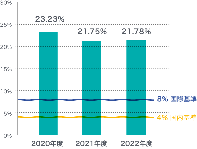金融機関の経営の健全性を示す重要な指標の一つとされる自己資本比率は、21.92%(2023年度)と引続き高い水準を維持しています。